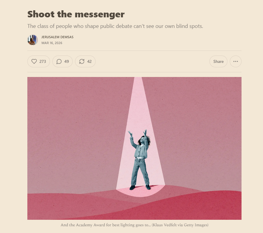 MEDIA MIS-FOCUS: Why’s there so much media coverage of certain topics that may or may not turn out to be all that important — AI, Trump, book bans? And what gets missed when news outlets over-focus on pet topics? That’s the subject of an invaluable new piece in The Argument called Shoot The Messenger, which blames the problem on socioeconomic and ideological homogeneity among those of us in mediating institutions like journalism and academia.